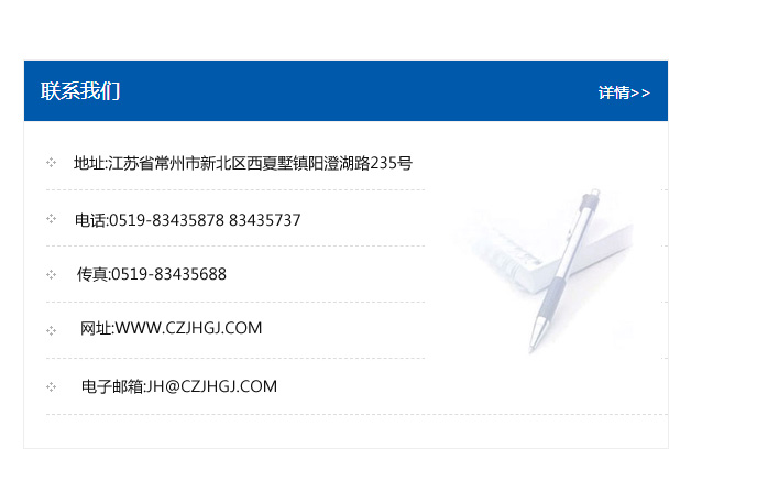 地址:常州市新北區友邦商務大廈1幢16、17層  電話:0519-85101652  傳真:0519-85112595  郵編:213022  網址:www.cz-jiayue_cn.zhanglidaoyan.com  郵箱:xiajifengaa@163.com